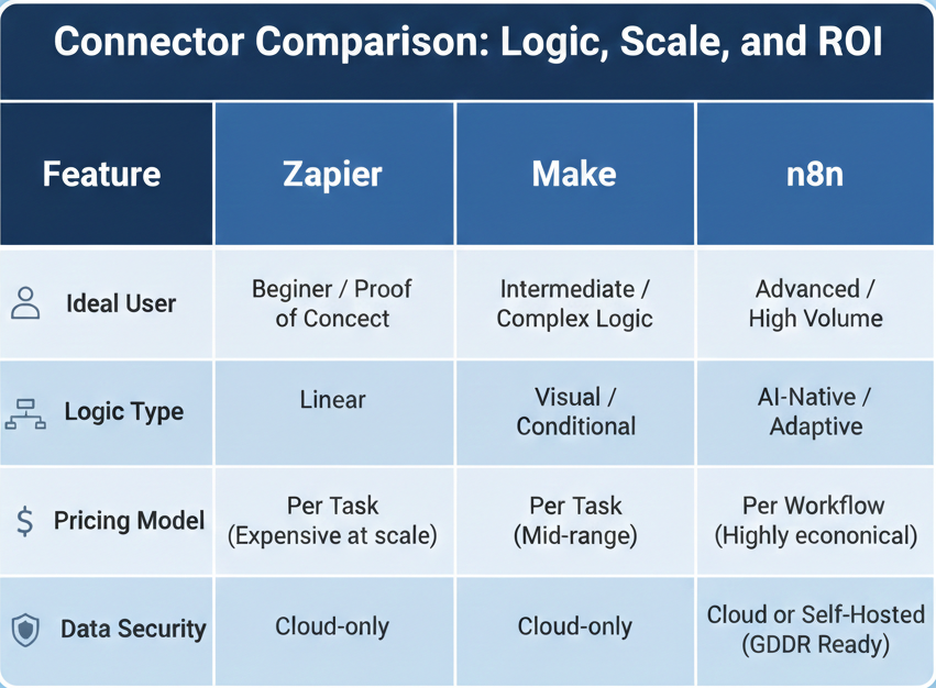 Which automation platform should I choose: Zapier, Make, or n8n? The ideal choice depends on your “Connector Progression Roadmap.” Zapier is best for beginners seeking simple, linear automations with a low learning curve. Make is superior for intermediate users needing complex conditional logic and visual process mapping. n8n is the premier choice for advanced users requiring high-volume processing, cost control through per-workflow pricing, and total data sovereignty via self-hosting.